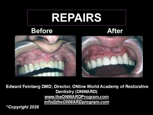 This course will cover definitive repairs for breakage of full coverage restorations. The course will outline the causes and prevention of breakage. Emphasis will be on the telescopic approach to definitively repair broken full coverage fixed bridgework. The philosophical approach and techniques will be thoroughly demonstrated.